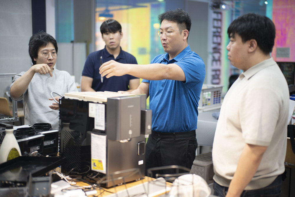 Jinkyu Kim, CEO of Dotwave (second from the right), is discussing product manufacturing with a mentor / Source=IT Donga