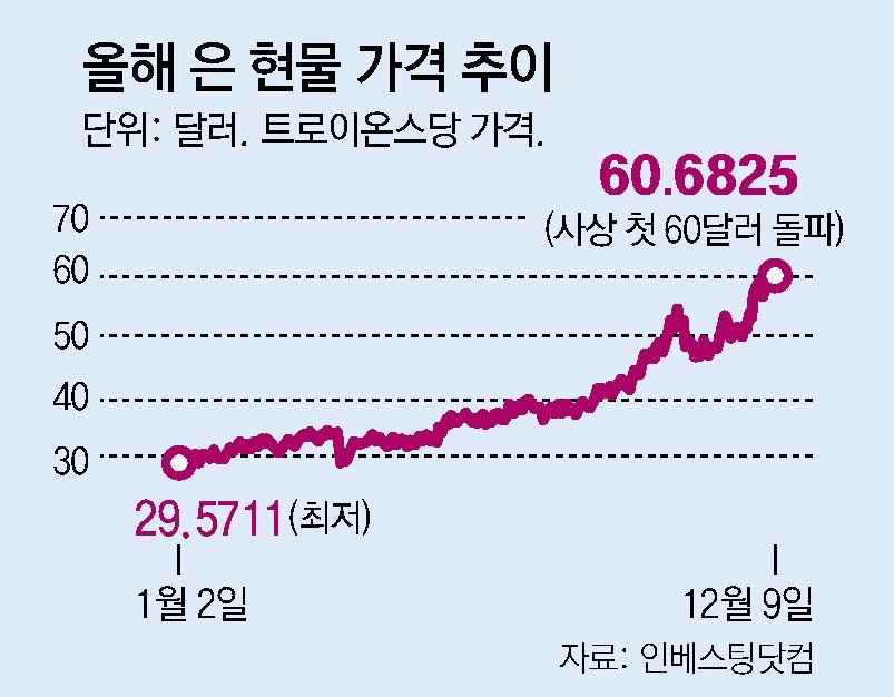 The price of silver has surpassed USD 60 (about KRW 88,000) per troy ounce (approximately 31.1 g) for the first time in history. Expectations of interest rate cuts in the United States combined with a surge in demand have driven silver prices to more than double this year alone, continuing a historic rally.