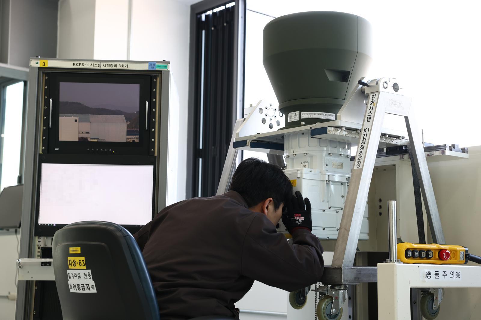 A Hanwha Systems employee conducts final performance testing of the K2 tank commander’s sight at a test facility. Provided by Hanwha Systems