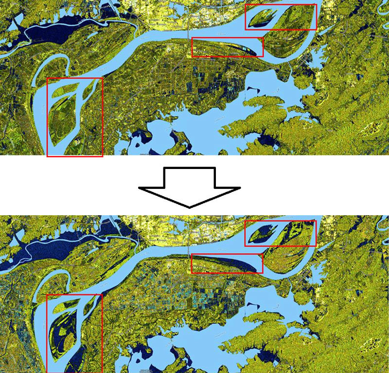 Using SAR data, StellarVision identified changes in flooding conditions in the Anqing area of Anhui Province from May to July 2024 / Source = Sentinel-1 data: ⓒ ESA