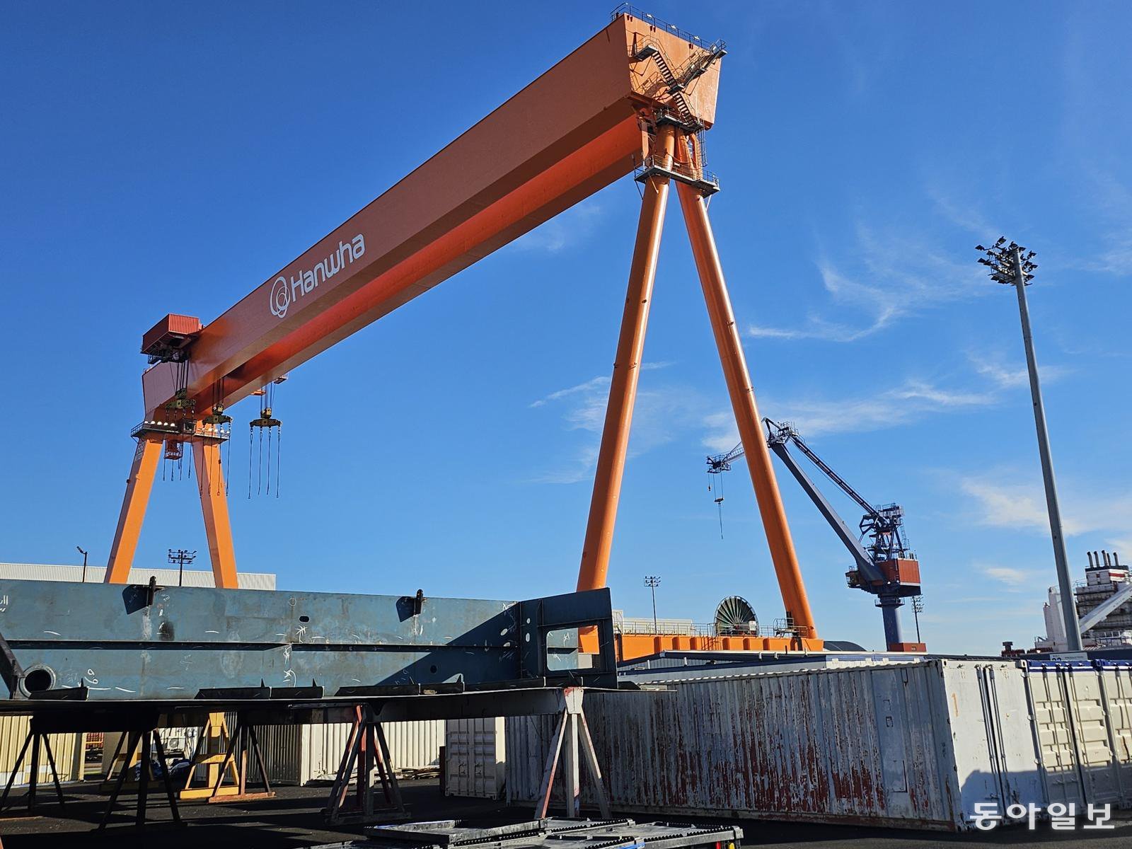 On December 22 (local time), Hanwha’s “Philly Shipyard” in Philadelphia, Pennsylvania, USA, was visited. At Dock No. 4, which has a dry dock where ships are built with seawater drained, a large Goliath crane was constructing the No. 5 National Security Multi-Mission Vessel (NSMV) and container ships.