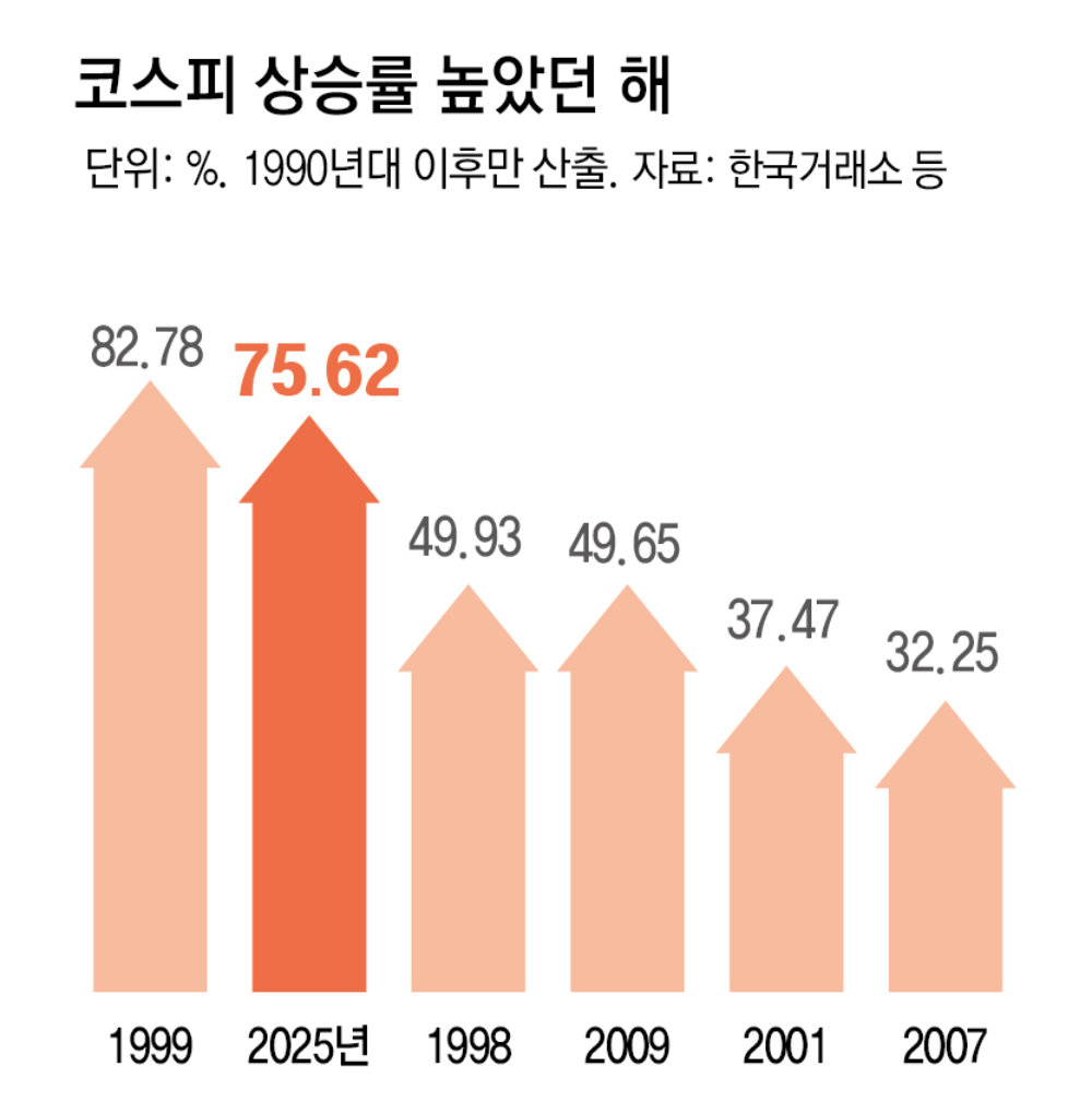 As a result, the KOSPI’s gain compared with the last trading day of last year (December 30) came to 75.62%. This far outpaced the annual gains of the US benchmark indices as of the 29th (local time), with the S&P 500 up 17.41% and the Nasdaq Composite up 21.56%.