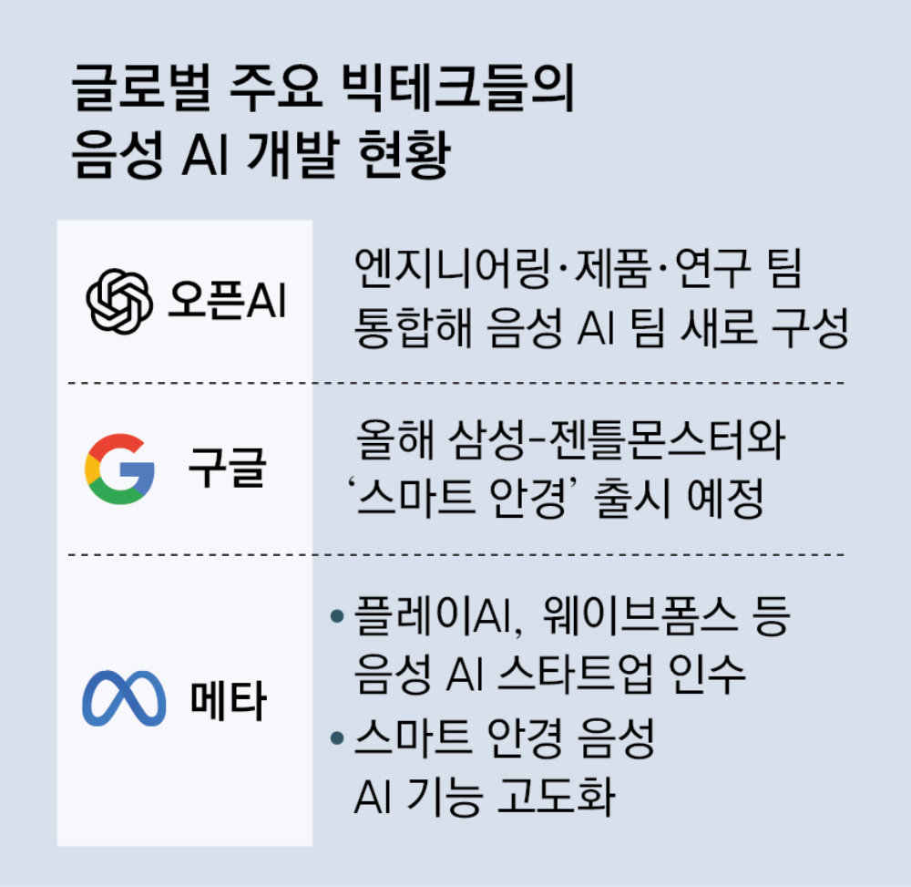 Industry observers predict that big tech firms’ voice AI development will, in the short term, lead to competition over new form factors (the physical format of mobile devices) such as smart glasses. Many also analyze that consumers’ AI usage patterns, which currently rely on visual interfaces, will shift toward audio-centered interactions. An official from the domestic AI industry said, “Because the main ways humans perceive information are through sight and hearing, voice AI has critical significance in AI development,” adding, “The accuracy of voice AI will also play a major role in enabling core functions of smart glasses, such as real-time translation.”