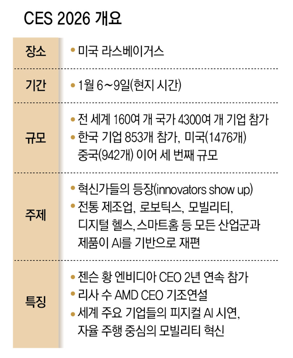 Meanwhile, Jensen Huang, CEO of Nvidia, is scheduled to appear on the CES stage for a second consecutive year through “Nvidia Live” on the 5th. Last year, he put forward physical AI as a key theme, and attention is focused on whether he will present a new theme this year. On the same day, AMD CEO Lisa Su, who will deliver this year’s CES keynote address, is expected to introduce changes driven by AI across multiple domains, including enterprise workplaces, devices, and servers.