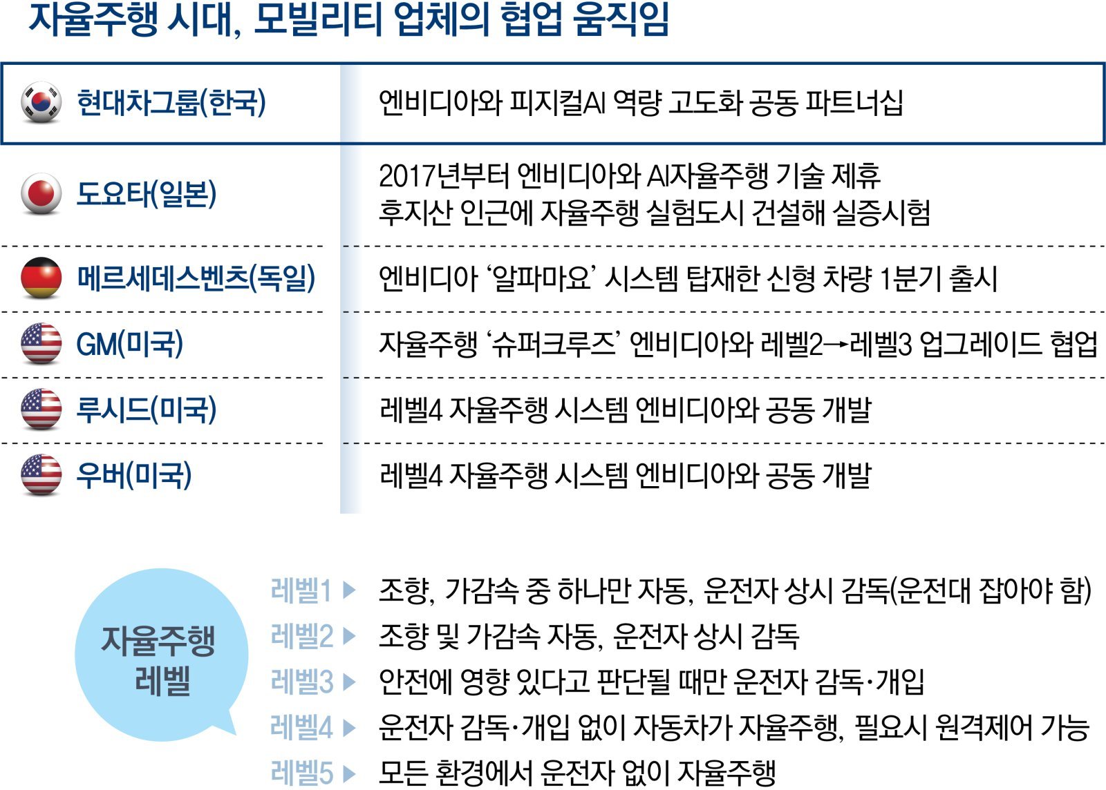 In the global automotive industry, collaboration on autonomous driving technologies with big tech companies such as NVIDIA is becoming mainstream. NVIDIA’s “Alpamayo” has already been installed in Mercedes-Benz’s new compact model “CLA” and is set to be launched in the U.S. market in the first quarter of this year. GM is jointly developing with NVIDIA an upgrade of its recently unveiled Level 2 (driver-supervised) “Super Cruise” fully autonomous driving system to Level 3 (driver-supervised only in emergencies). U.S. electric vehicle maker Lucid and Uber are also working with NVIDIA to develop Level 4 (driver-unsupervised) autonomous driving systems.
