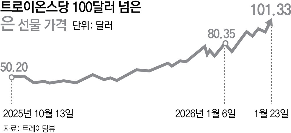 March delivery silver futures closed at USD 101.33 (about KRW 147,500) per troy ounce, up 5.15% from the previous trading day. Silver exceeded USD 100 for the first time in history, and during intraday trading it rose as high as USD 103.53 (about KRW 150,000). Following an annual increase of more than 150% last year, international silver prices have risen more than 40% from 2 January, the first trading day of this year, through this date.