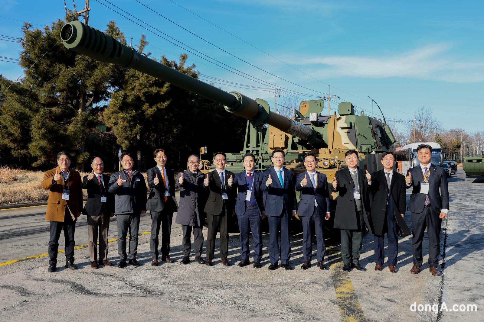 After the “Win-Win Cooperation Declaration Ceremony for Innovation in the Defense and Aerospace Industry” held at Hanwha Aerospace’s 3rd Plant in Changwon Special City, Gyeongsangnam-do, on the 3rd, officials pose for a commemorative photo in front of a K9 self-propelled howitzer.