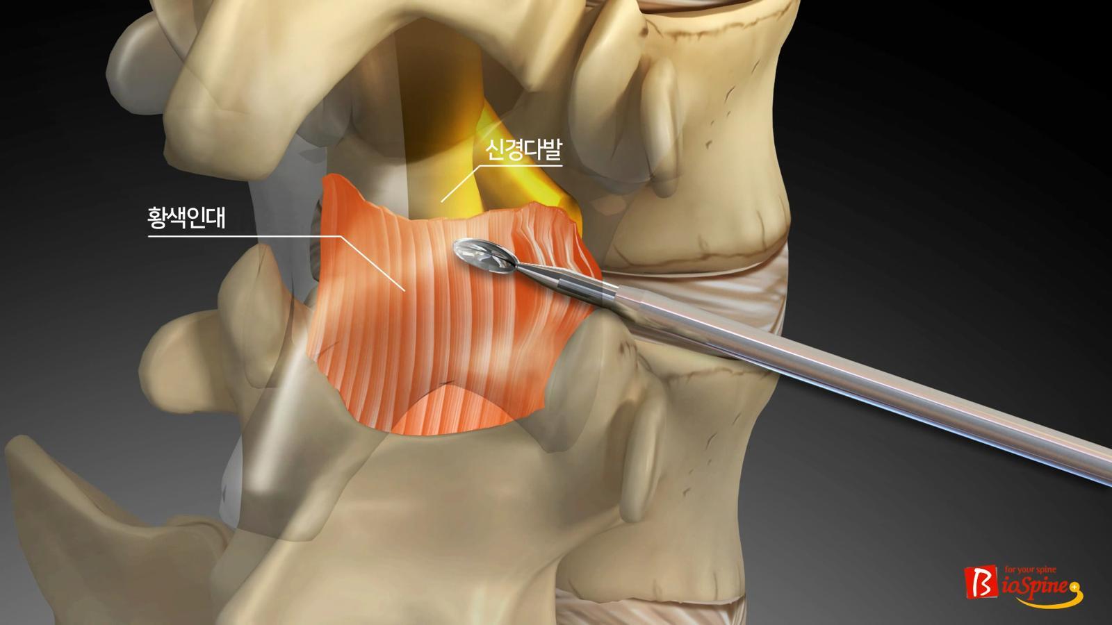 Foraminal decompression, in which a special kit is used to resect the ligamentum flavum at the posterior portion of the intervertebral foramen to widen the space. Seoul Gwanghye Hospital
