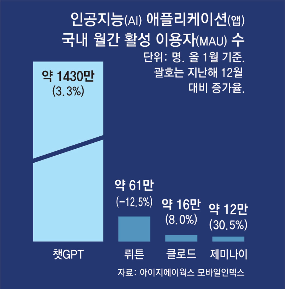 During the same period, OpenAI’s AI model ChatGPT recorded 14,299,545 MAU in Korea, far exceeding other AI models. It was followed by A.Dot (1,386,537), Perplexity (731,318), Grok (721,293), Wrtn (608,220), and Claude (158,136) in terms of MAU.