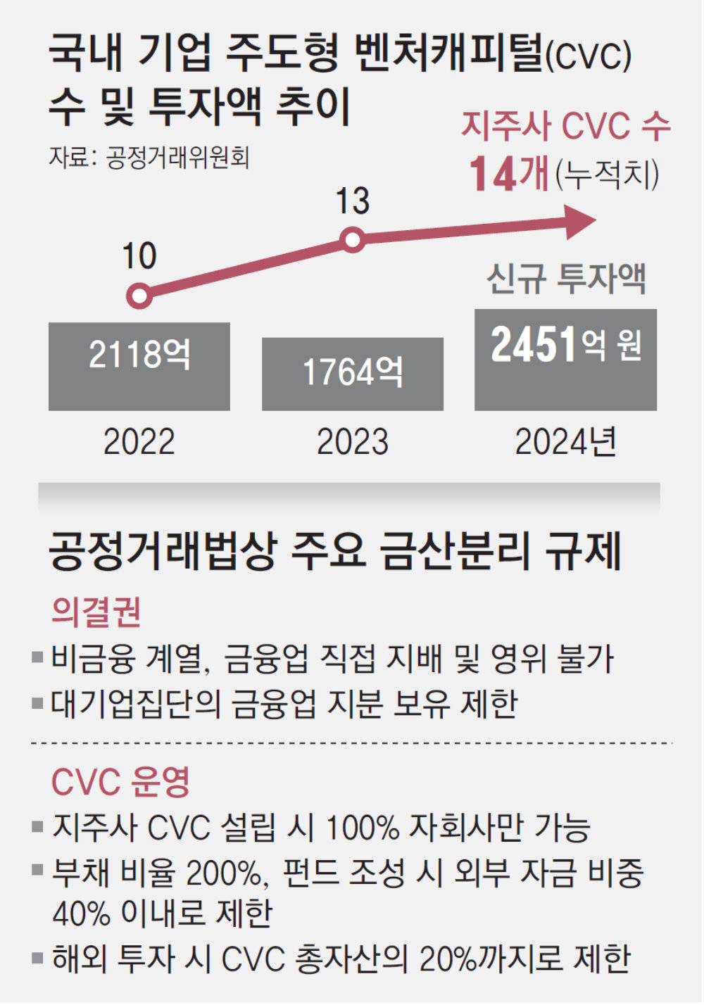 ● Fair Trade Commission Considers Legal AmendmentsIn Korea, a CVC system that allows holding companies to invest was introduced in 2021, but it has not been activated due to various regulations. According to the 'Monopoly Regulation and Fair Trade Act' (Fair Trade Act), general holding companies must own CVCs as 100% subsidiaries, and external funds are only allowed up to 40% when raising investment funds. Overseas investments cannot exceed 20% of total assets. They also cannot play the role of a GP, gathering investors to form funds and leading investments.