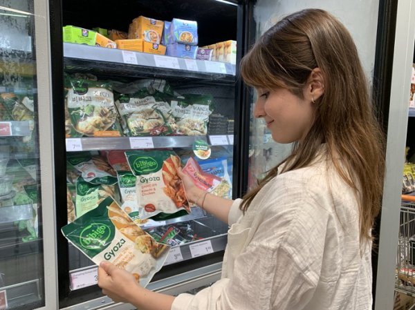 A consumer inspecting Bibigo Dumpling products at a Globus store in Frankfurt, Germany