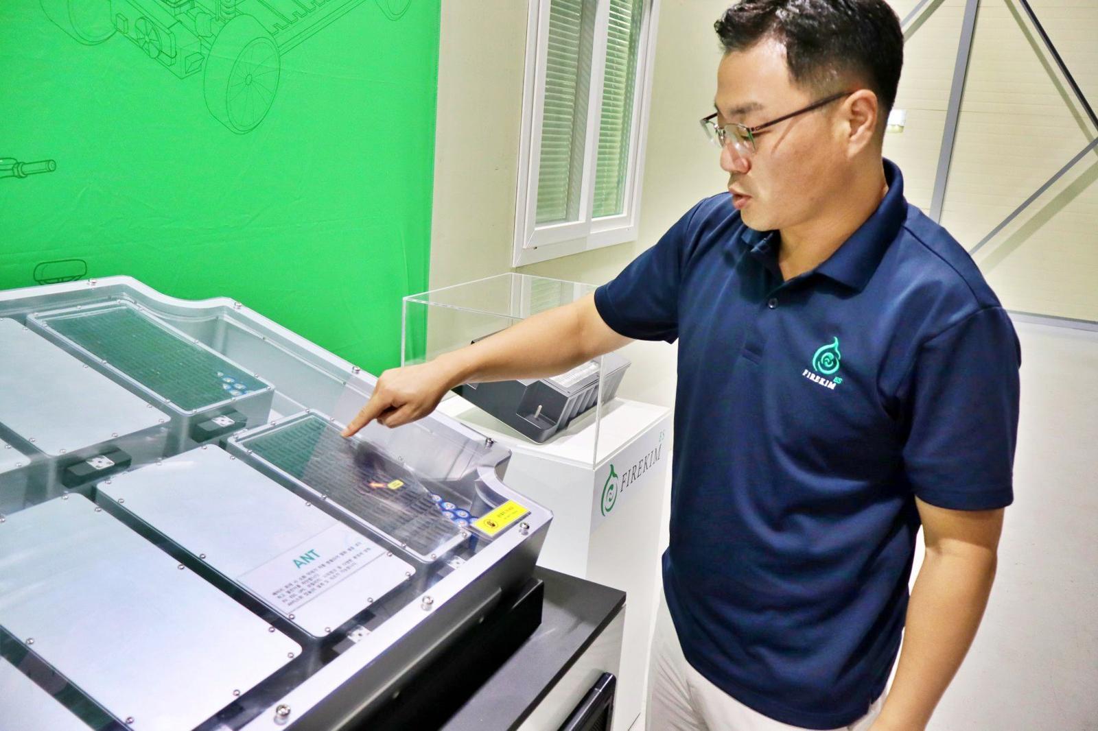 CEO Kim Byung-yeol explaining the operation principle of the battery fire-specific extinguishing system / Source=IT Donga