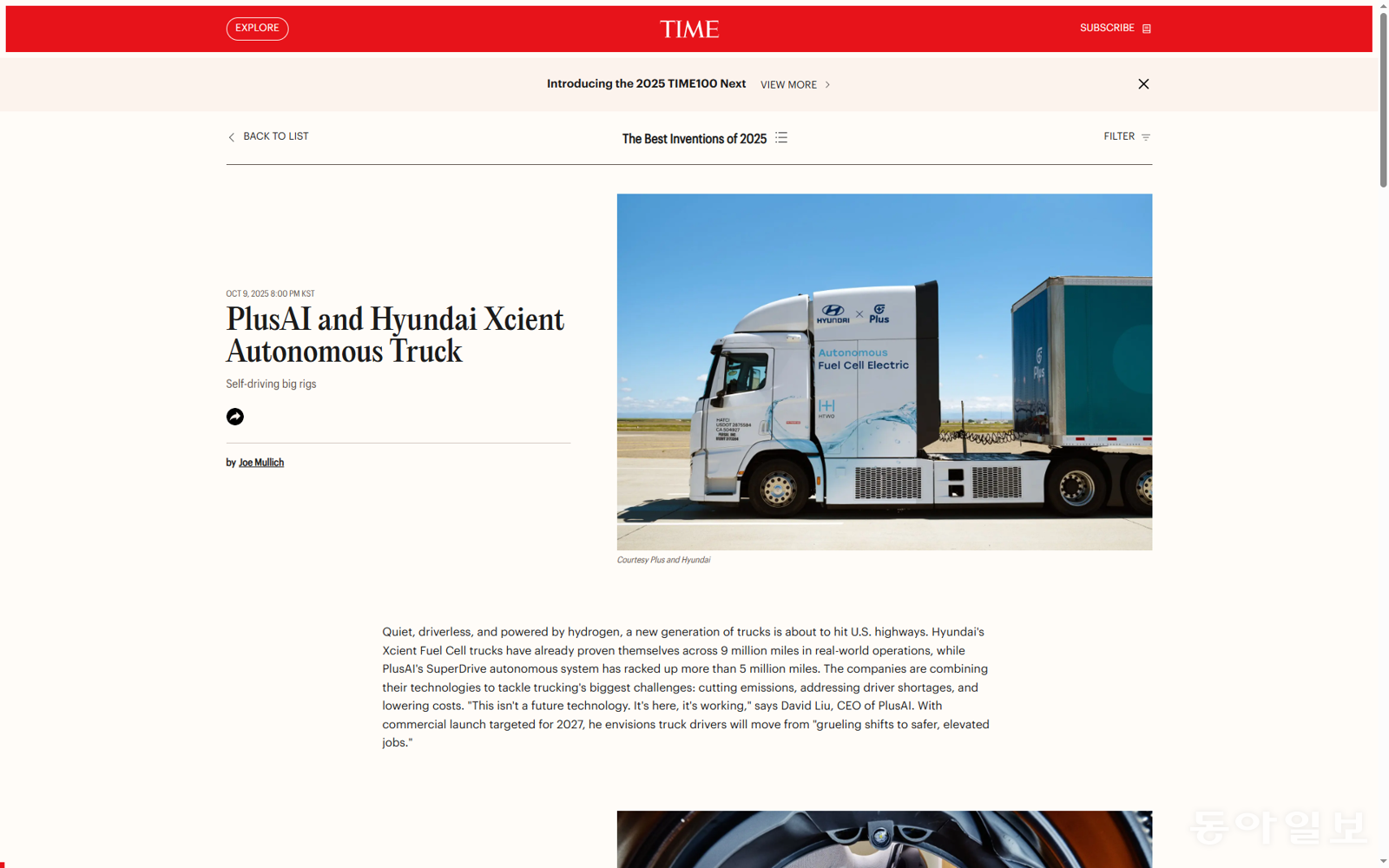 TIME's introduction screen selecting Hyundai's hydrogen fuel cell autonomous truck 'Xcient' as one of the 'Best Inventions of the Year'. Photo source: TIME website