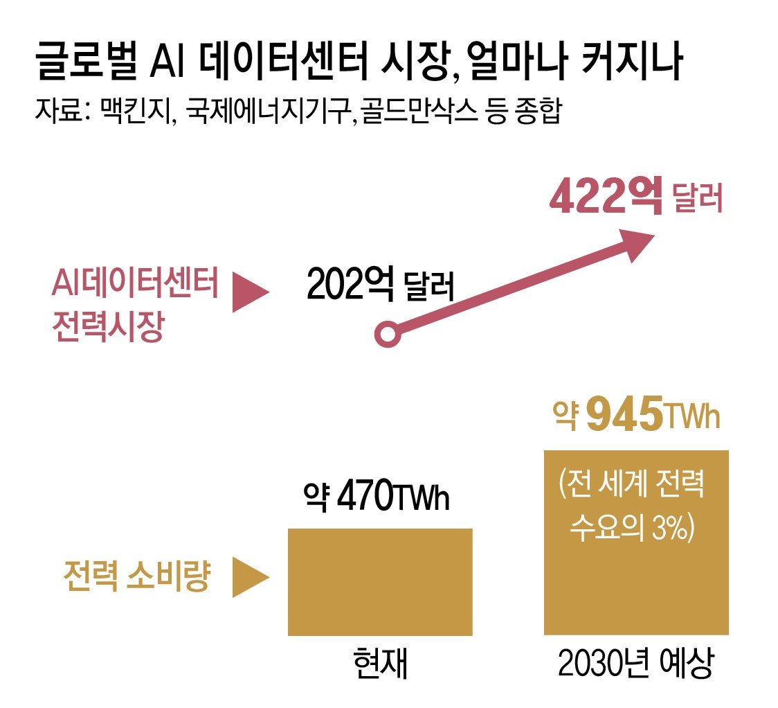 However, the surge in power demand from AI data centers is opening opportunities for Korea. According to the International Energy Agency (IEA), the power demand for data centers, which was 470 TWh last year, is expected to nearly double to 945 TWh by 2030. The IEA forecasts that the expected power demand in 2030 will account for 3% of the global power demand at that time. Consequently, the overall power infrastructure market related to AI data centers is expected to grow from USD 20.2 billion (approximately KRW 28.8 trillion) to USD 42.2 billion (approximately KRW 60.2 trillion) during the same period.