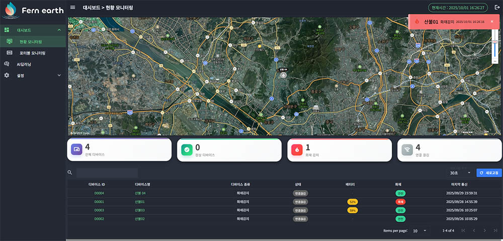 Currently, wildfire detection systems primarily use CCTV, drones, and helicopters. However, CCTV requires a stable power supply, limiting installation locations, and drones and helicopters have limited flight times. There are also blind spots and limitations such as a shortage of operational personnel.