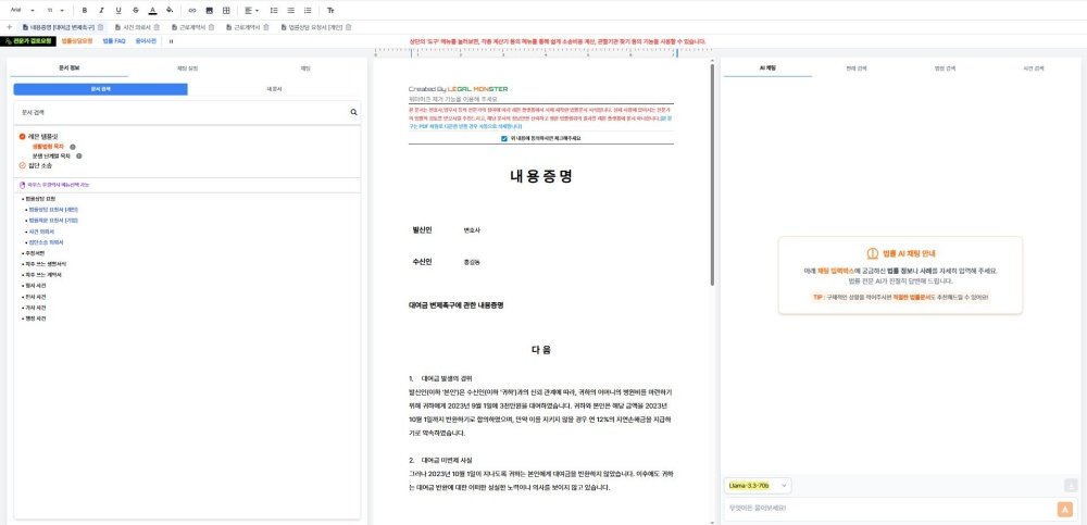 Lemon utilizes APIs (Application Programming Interfaces) of various AI tool LLM (Large Language Model) services such as OpenAI's ChatGPT, Meta's LLaMA3, and Grok. After inputting prompts into these LLMs and receiving results, they are combined with a proprietary algorithm to create document forms, supporting web-based legal document editing for convenience and high stability. It provides methods for submitting legal documents through the 'Related Legal Information and Document Usage Method' menu, and evidence can also be attached and saved as files. Legal document automatic generation and editing are available for free, but some features, such as 'Request for Expert Review' and 'Request for Legal Consultation,' incur costs.