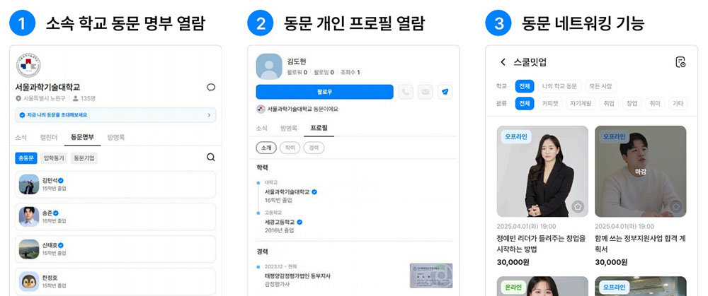 CEO Song Jun: SchoolMeets is a platform where alumni can share updates and network freely based on trust. It secures trust through thorough alumni verification and combines data-driven matching technology to ensure safe and efficient networking for users. Additionally, it converts activities within the network into data and experiences, creating a structure where both alumni and companies can gain value.