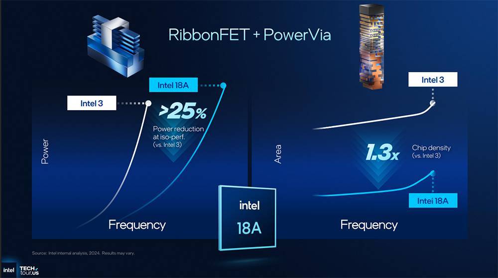 Intel announced that with the application of RibbonFET and PowerVia, power efficiency improved by up to 25% and chip density increased by 30% compared to Intel 3 / Source=Intel