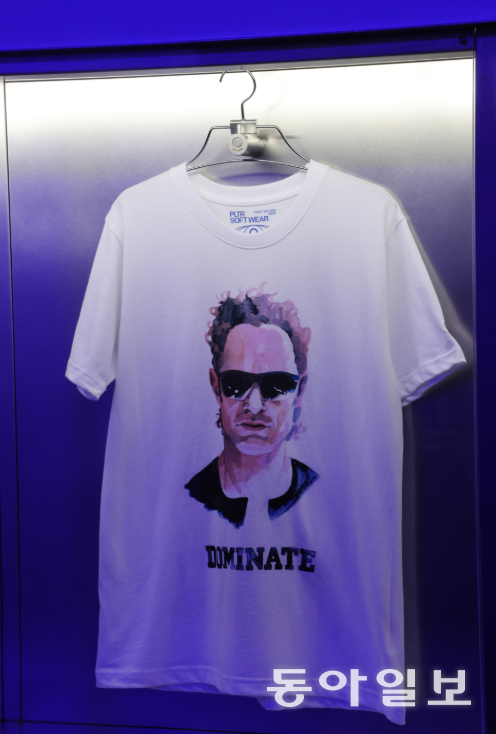 T-shirts displayed at the Palantir pop-up store, featuring a large image of CEO Karp's face. Hong Jin-hwan, reporter