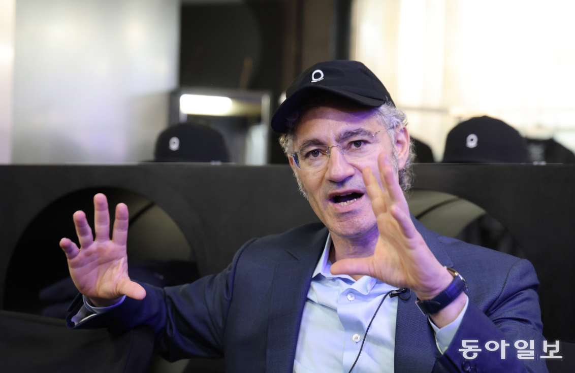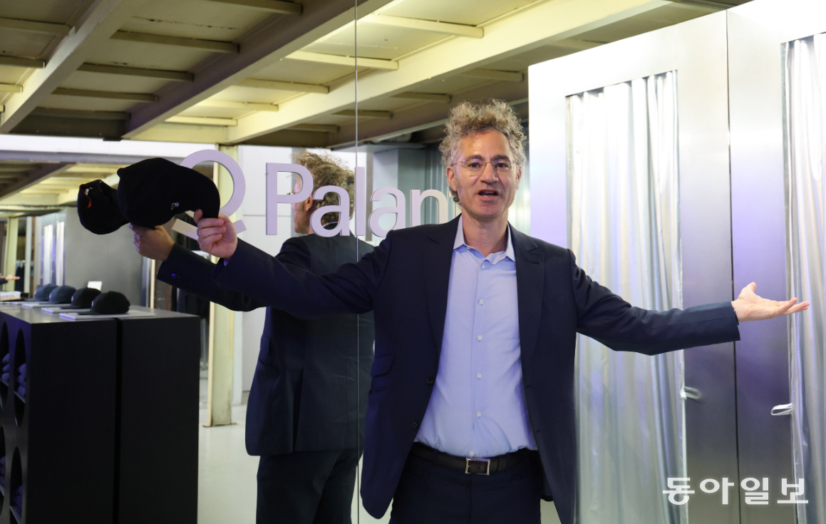 When asked to pose, Alex Karp inquires whether to wear or remove his hat. The black hat with the Palantir logo was merchandise sold at the Palantir pop-up store. The sale price was KRW 87,000. Hong Jin-hwan, reporter