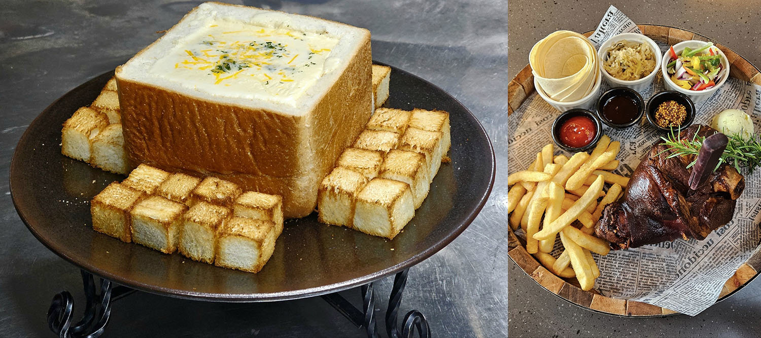 Beerport Brewery's signature dishes, Bread Fondue (left) and Schweinshaxe (right) / Source=Beerport Brewery