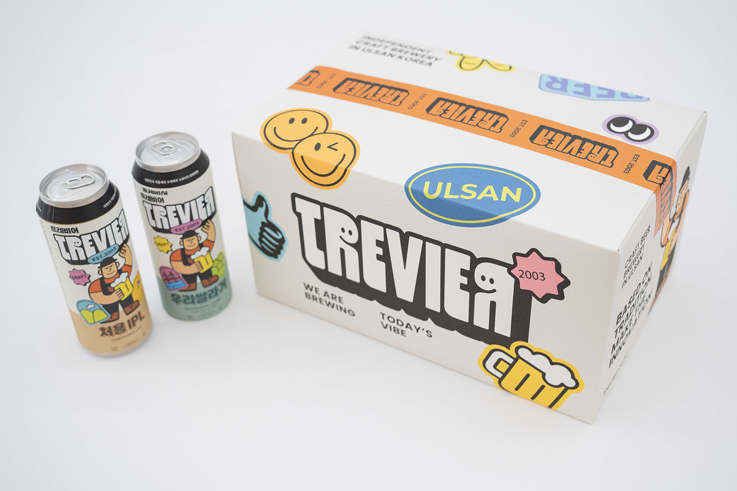 Collaboration results of Beerport Brewery participating in the Ulsan Design-Driven Manufacturing Innovation Center design support project. Beerport Brewery collaborated with GrafiDesign to innovate the Trevier logo and can design / Source=IT Donga