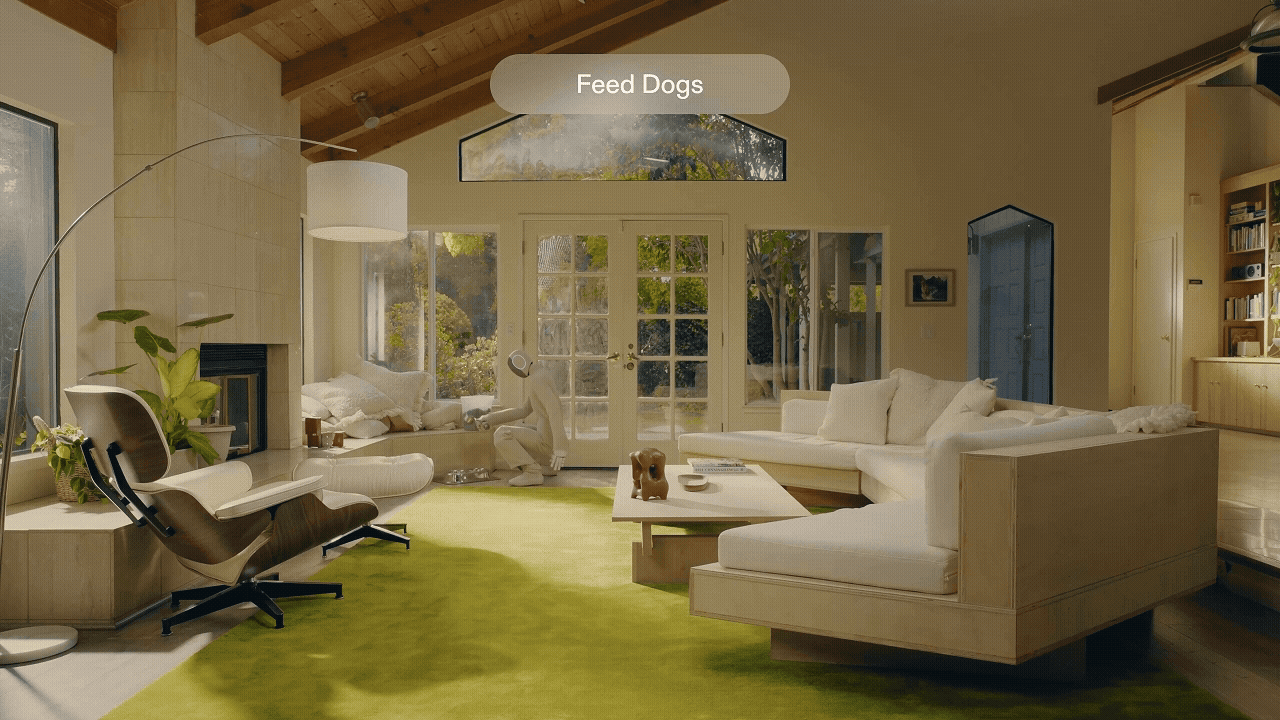 ‘NEO’ performs various household tasks such as feeding the dog, tidying the sofa, and folding laundry. Photo=1X