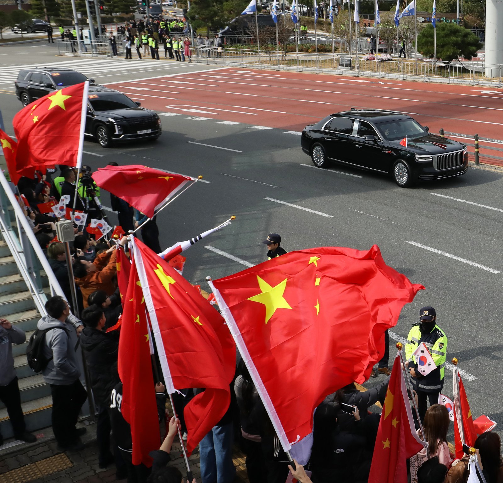 The Hongqi N701 carrying Chinese President Xi Jinping moves from Gimhae International Airport in Gangseo-gu, Busan, to Gyeongju, Gyeongbuk, to attend the Asia-Pacific Economic Cooperation (APEC) Summit after concluding the US-China summit on the 30th. News1