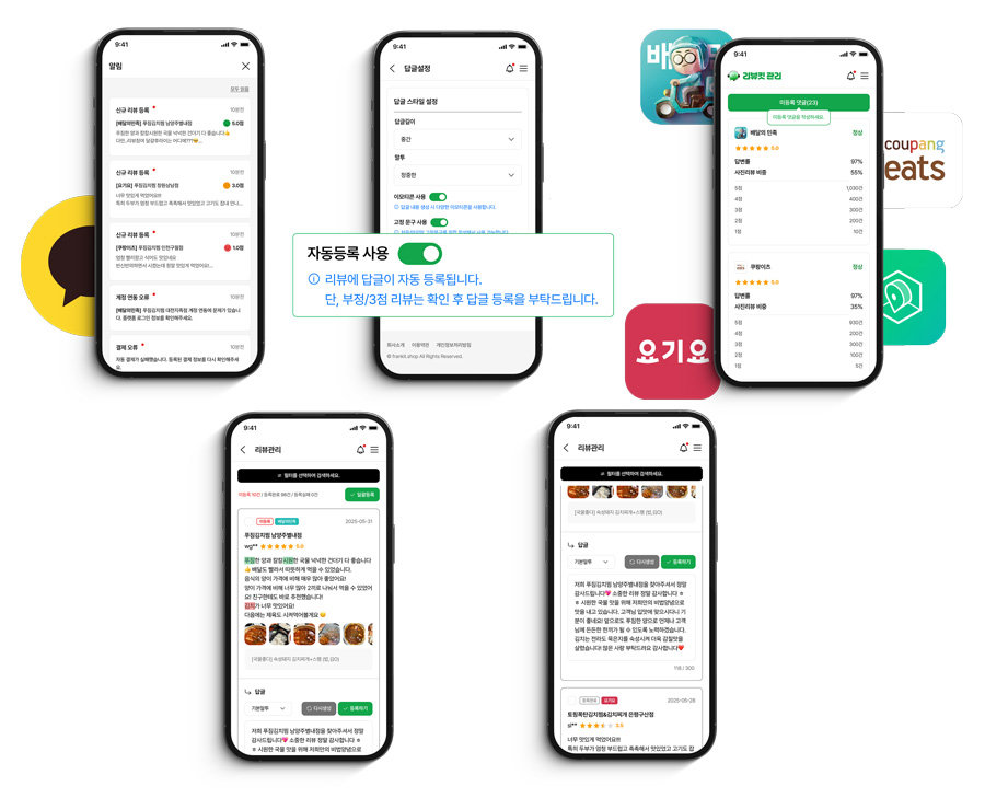As the business expanded in this way, it ventured into the store operation solution field. Particularly, delivery food service owners had the challenge of responding to customer reviews to encourage reorders, which involved checking multiple platforms like Baemin, Coupang Eats, Yogiyo, and Naver. We addressed this difficulty by integrating the AI-based automatic response feature 'Reviewkit' into the Frankit platform.
