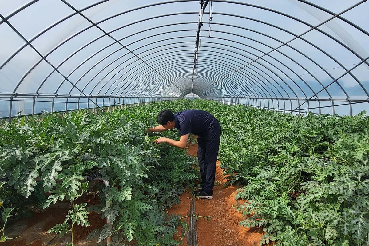 CEO Cho Guk-rae checking the state of watermelons cultivated with the elevated cultivation device / Source=Green Seed