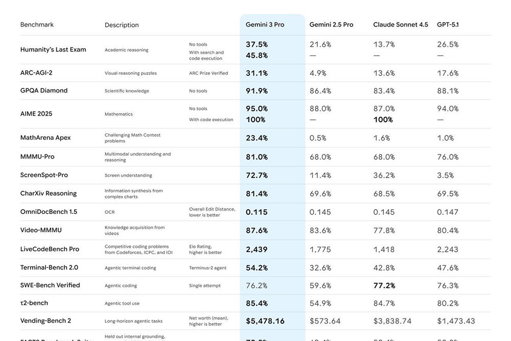 Benchmark test results of Gemini 3 Pro, 2.5 Pro, Claude Sonnet 4.5, and GPT-5.1 versions / Source=Google